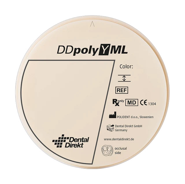 A DD poly Y ML előszínezett, többrétegű CAD/CAM marókorongok polimetil-metakrilát (PMMA) alapanyagból. Az anyag öt rétegben harmonikusan kialakított árnyalatokat kínál, amelyek természetes színátmenetet hoznak létre, így élethű megjelenést biztosítanak. A DD poly Y ML a DD base P HI anyaggal kombinálva használható, hogy pontos digitális fogpótlási megoldást nyújtson optimális esztétikával és funkcionalitással.